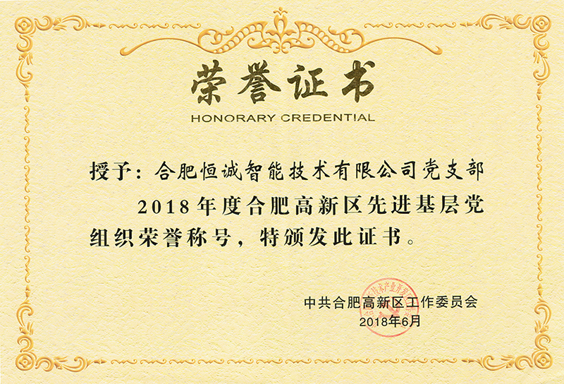 恒誠智能黨支部榮獲“2018年度合肥高新區(qū)先進(jìn)基層黨組織”榮譽(yù)稱號(hào)