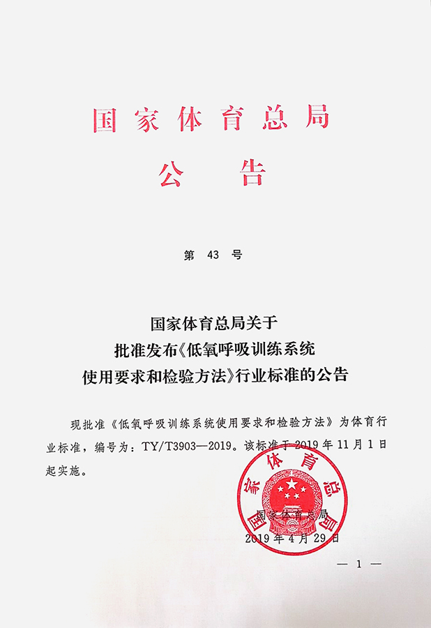 合肥恒誠智能技術(shù)有限公司《低氧呼吸訓(xùn)練系統(tǒng)使用要求和檢驗方法》行業(yè)標準經(jīng)過了起草、征求意見、審查、報批等一系列流程,于4月29日正式獲批發(fā)布,編號:TY/T3903-2019,標準于2019年11月1日起實施。